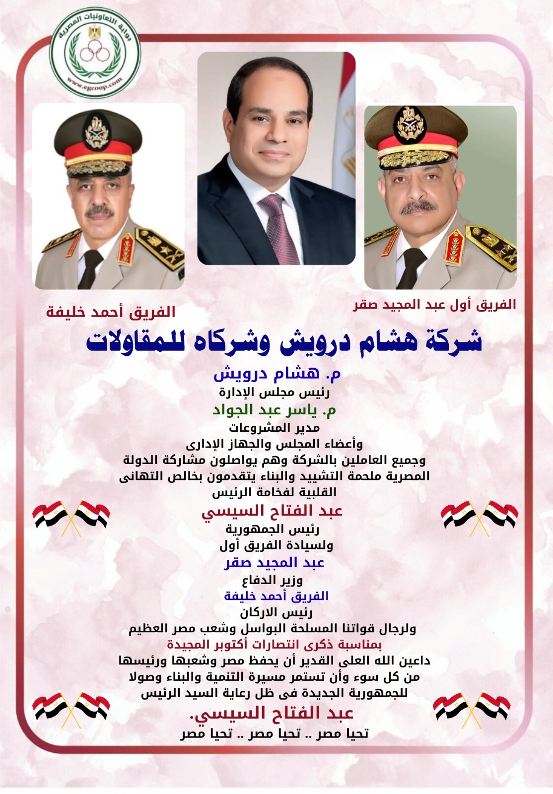 شركة هشام درويش وشركاه للمقاولات تهنئ الرئيس السيسي بذكرى انتصارات أكتوبر