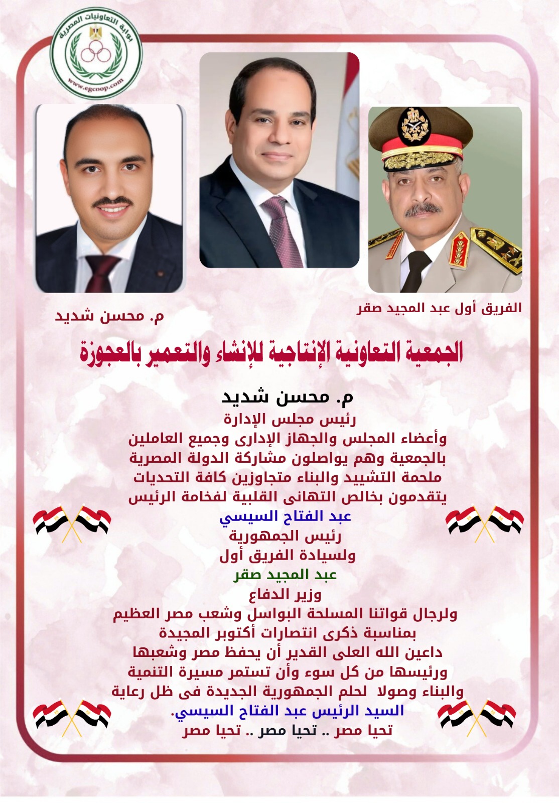 الجمعية التعاونية الإنتاجية للإنشاء والتعمير بالعجوزة تهنئ الرئيس السيسي بذكرى انتصارات أكتوبر