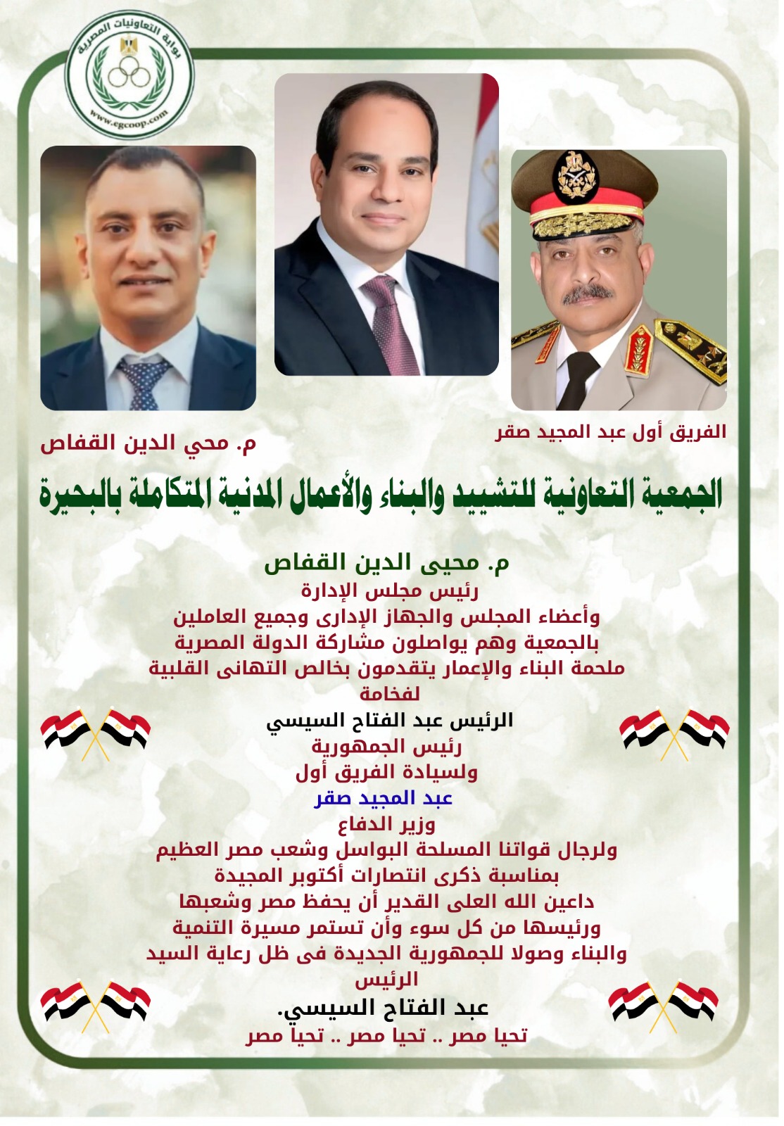 الجمعية التعاونية للتشييد والبناء والأعمال المدنية المتكاملة بالبحيرة تهنئ الرئيس السيسي بذكرى انتصارات أكتوبر