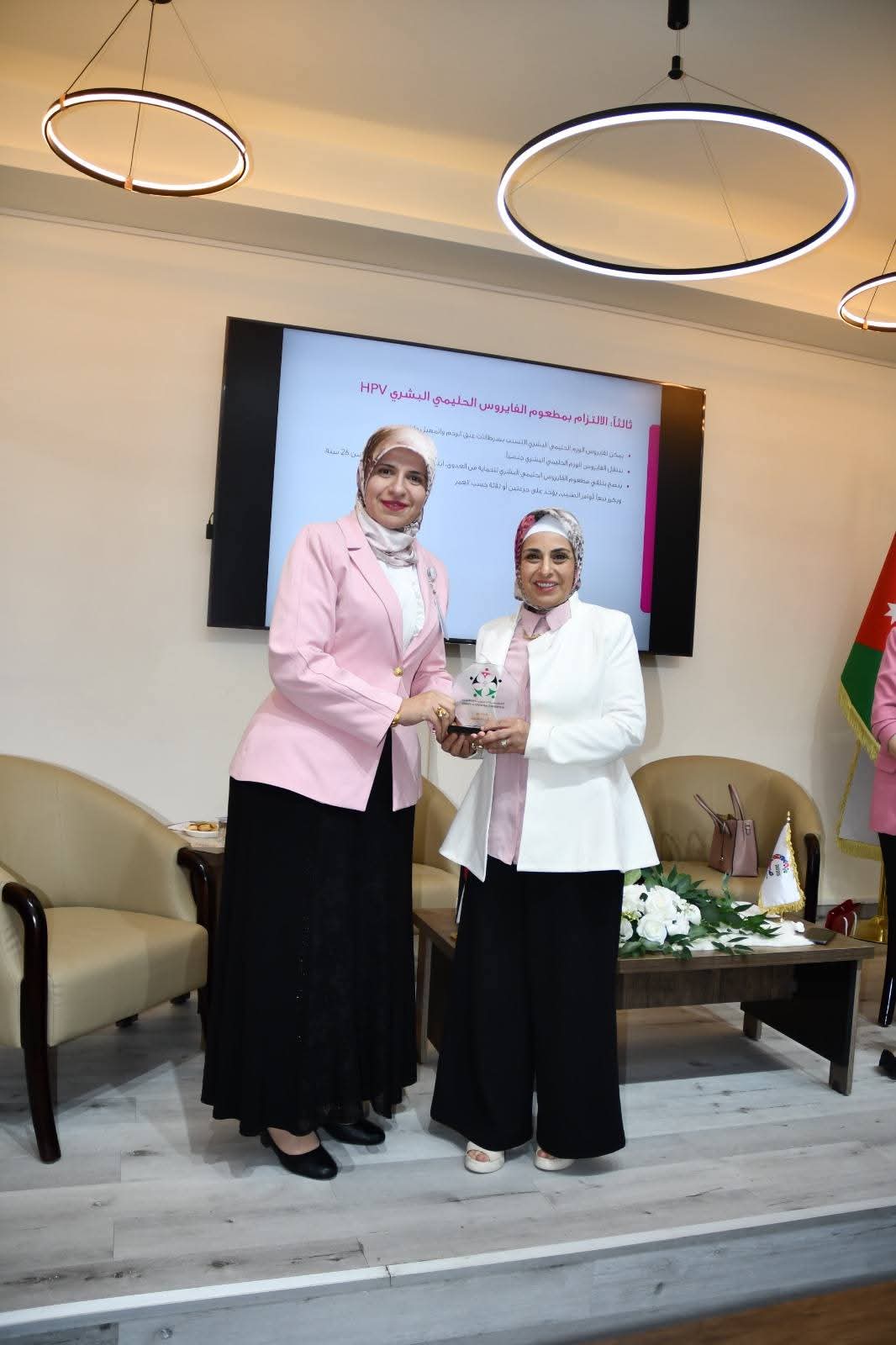 وهذا، وتخلل الورشة عرض فيديو تثقيفي حول مرض سرطان الثدي، وطرق الكشف المبكر عنه، والوقاية منه، إلى جانب توزيع نشرات عن المرض من إعداد مؤسسة الحسين للسرطان، كما تم تكريم كلٍ من الدكتورة ميس شديد، والمدربة عبير البيك بتسليمهما درع المؤسسة التعاونية الأردنية؛ وذلك تقديراً لجهودهما في مجال التوعية والتثقيف للزميلات.