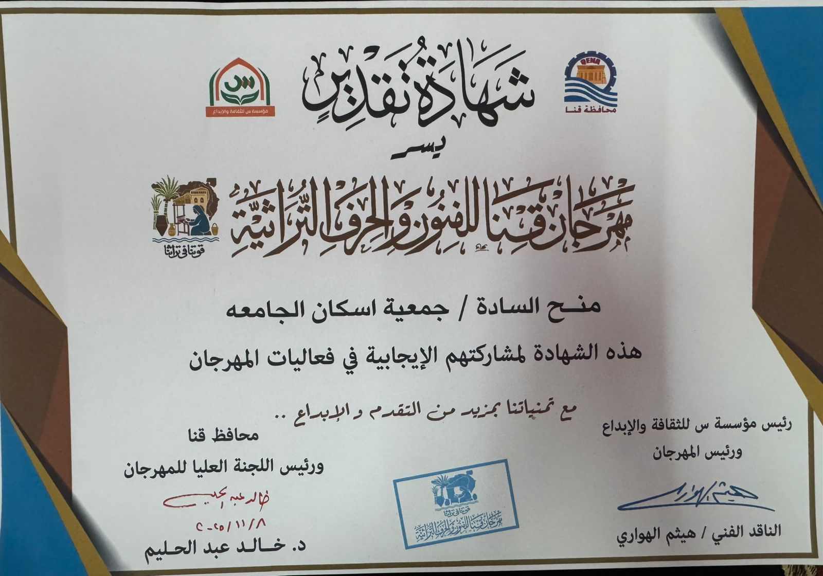 لدورها المتميز ومشاركتها الفعالة فى مهرجان قنا للفنون والحرف التراثية كرم د. خالد عبد الحليم - محافظ قنا جمعية إسكان العاملين بجامعة جنوب الوادى فى الحفل الختامى لمهرجان قنا للفنون والحرف التراثية الذى أقيم على مسرح قصر ثقافة قنا تحت رعاية د. مصطفى مدبولى - رئيس مجلس الوزراء وبالتعاون مع وزارتى الثقافة والسياحة وتنظيم محافظة قنا بالشراكة مع مؤسسة "س" للثقافة والإبداع وسط حضور جماهيرى كبير.