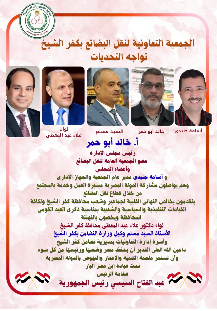 أكد خالد أبو حمر ـ رئيس مجلس إدارة الجمعية التعاونية لنقل البضائع بكفر الشيخ عن دعم جميع أعضاء المجلس والجهاز الإدارى والجمعية العمومية لجهود السيد الرئيس عبد الفتاح السيسي من أجل الحفاظ على أمننا القومى والعربى واستكمال مسيرة النهضة التى تشهدها الدولة المصرية.