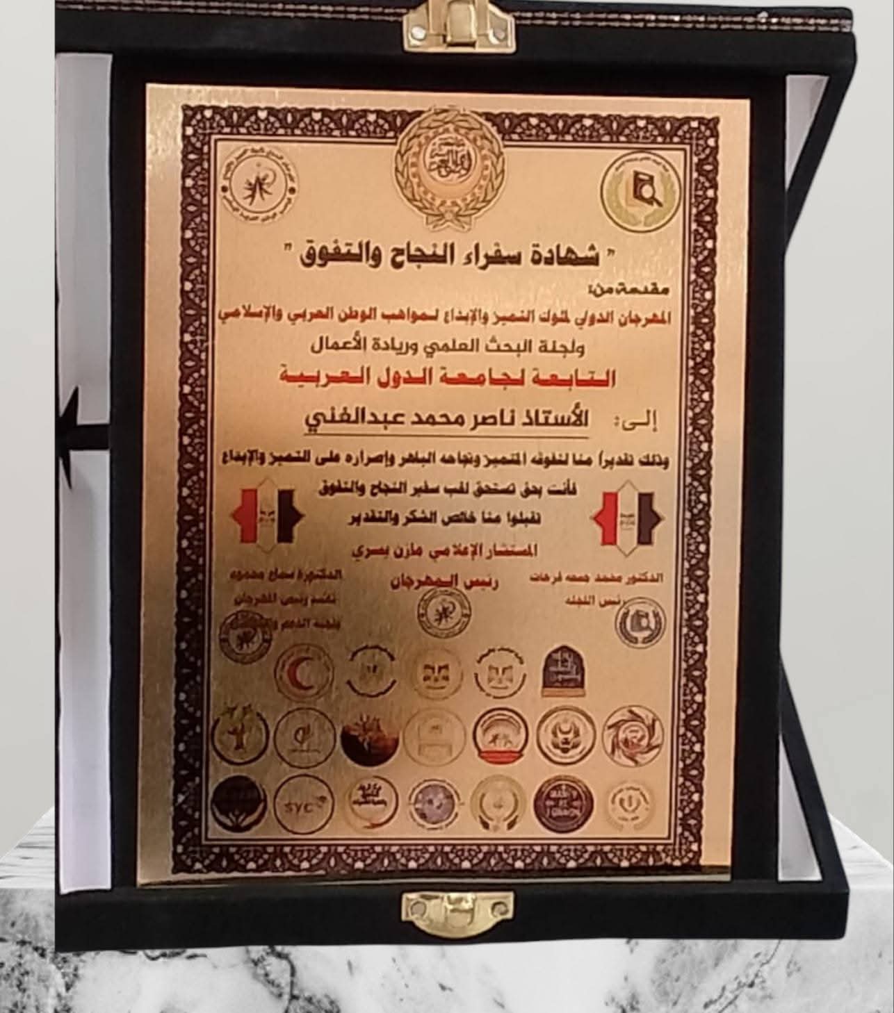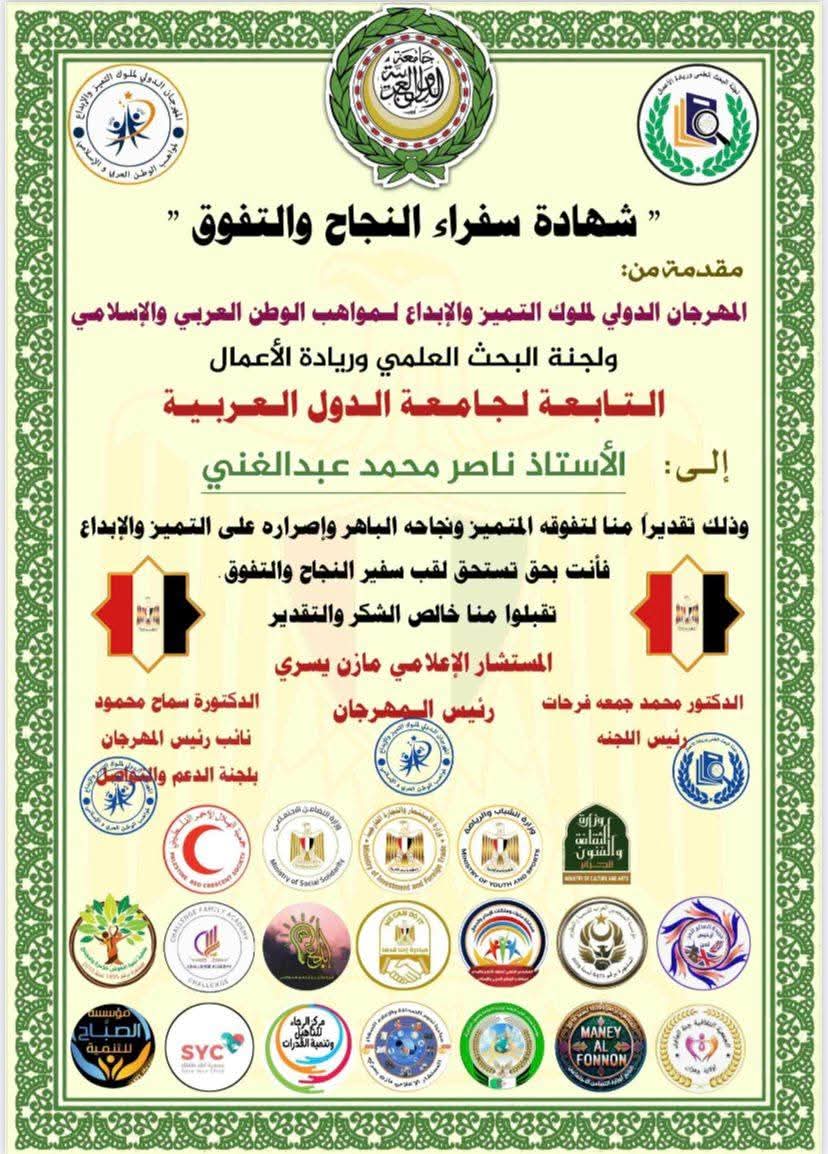 خالد السجاعى - رئيس مجلس إدارة بوابة "التعاونيات المصرية" عضو مجلس أمناء مدرسة "عليه توفيق الثانوية بنات" وأسرة التحرير يتقدمون بخالص التهانى القلبية المربى الفاضل الأستاذ ناصر عبد الغنى بمناسبة حصوله على درع التميز والإبداع من لجنة البحث العلمى وريادة الأعمال التابعة لجامعة الدول العربية تقديرا لدوره المتميز وتفوقه الباهر ما جعله سفيرا للنجاح والتفوق وقدوة يحتذى بها للأجيال القادمة .. مع خالص الأمنيات الطيبة لسيادته بمزيد من التوفيق والنجاح.