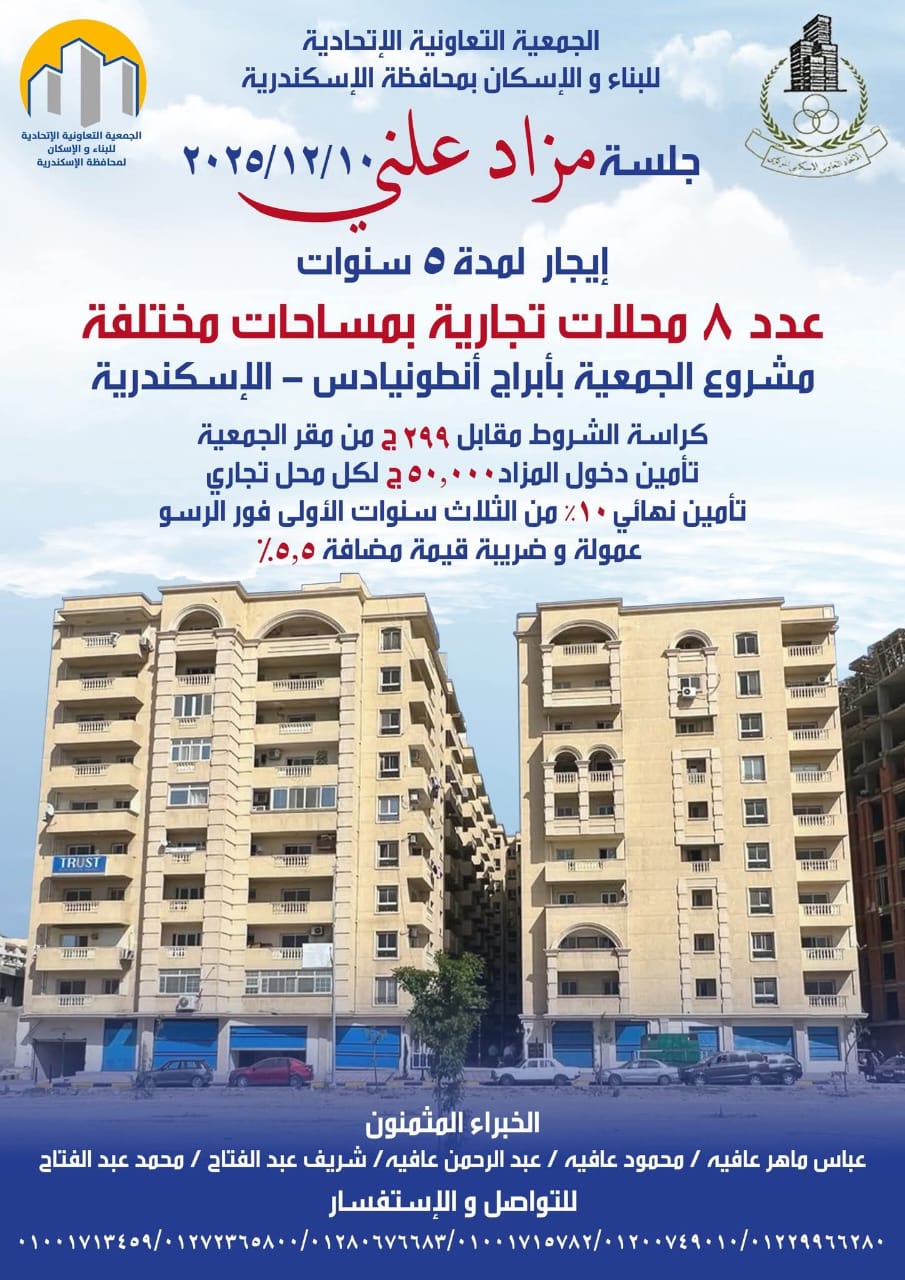 أعلنت الجمعية التعاونية الاتحادية للبناء والإسكان بمحافظة الأسكندرية عن إجراء "مزاد علنى" يوم 10 ديسمبر المقبل لإيجار عدد (8) محلات تجارية بمساحات مختلفة بأبراج انطونيادس بالأسكندرية وذلك لمدة خمس سنوات.