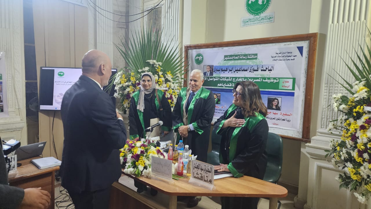 وضمّت في عضويتها السفيرة سها جندي (مناقشًا)، وأ.د. ريم عادل، أستاذ العلاقات العامة والإعلان بكلية الإعلام – جامعة القاهرة، ورئيس قسم بحوث ودراسات الإعلام بالمعهد (مناقشًا).