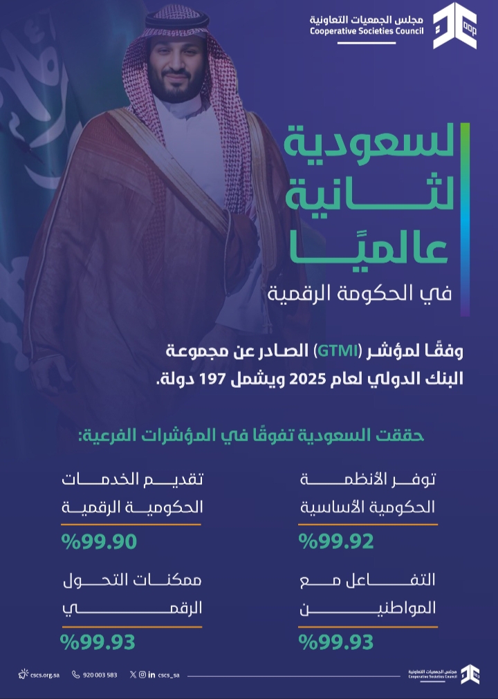 مجلس الجمعيات التعاونية بالسعودية يثمن الإنجاز الوطنى .. المملكة ”الثانية” عالميا فى الحكومة الرقمية