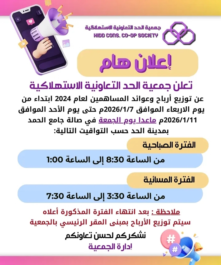 أعلنت جمعية "الحد" التعاونية الاستهلاكية بالبحرين عن بدء توزيع العوائد والأرباح لعام 2024 على المساهمين بداية من اليوم الأربعاء الموافق ٧ يناير ٢٠٢٥ حتى الأحد المقبل ١١- يناير ٢٠٢٥ وذلك بصالة جامع الحمد بمدينة الحد.