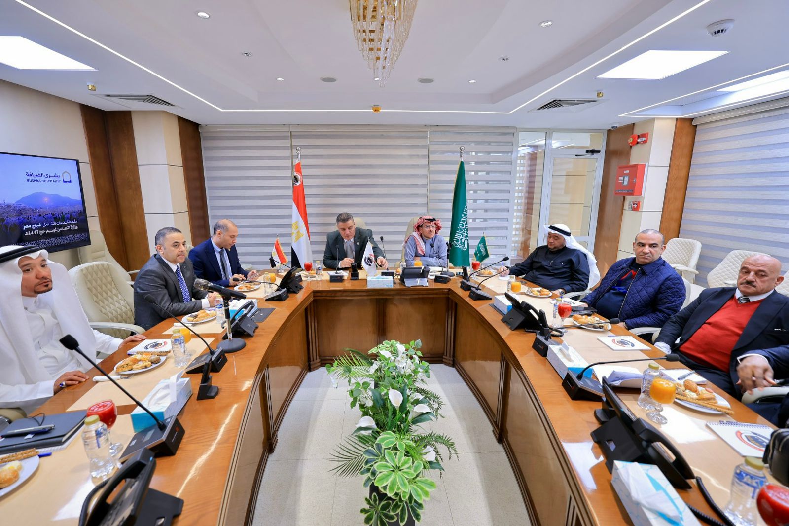 ويضم وفد شركة بشرى الضيافة سعادة الأستاذ علي بن حسين بندقجي، الرئيس التنفيذي لشركة بشرى الضيافة، والوفد المرافق له، وهم الأستاذ محمد ميمني نائب الرئيس التنفيذي، والأستاذ ياسر بخاري الرئيس التنفيذي للخدمات اللوجستية، والأستاذ ياسر باويان رئيس المجلس التنفيذي لحجاج مصر، والدكتور محمد حبيبب رئيس مجلس إدارة شركة الدار البيضاء والوفد المرافق له، كما شهد اللقاء حضور المستشار كريم قلاوي نائب رئيس مجلس الدولة المستشار القانوني لوزيرة التضامن الاجتماعي، الأستاذ عمرو حسني رئيس الوحدة المركزية للجمعيات الأهلية نائب المدير التنفيذي للمؤسسة القومية لتيسير الحج، والأستاذ محمد رشوان المدير المالي والإداري للمؤسسة.