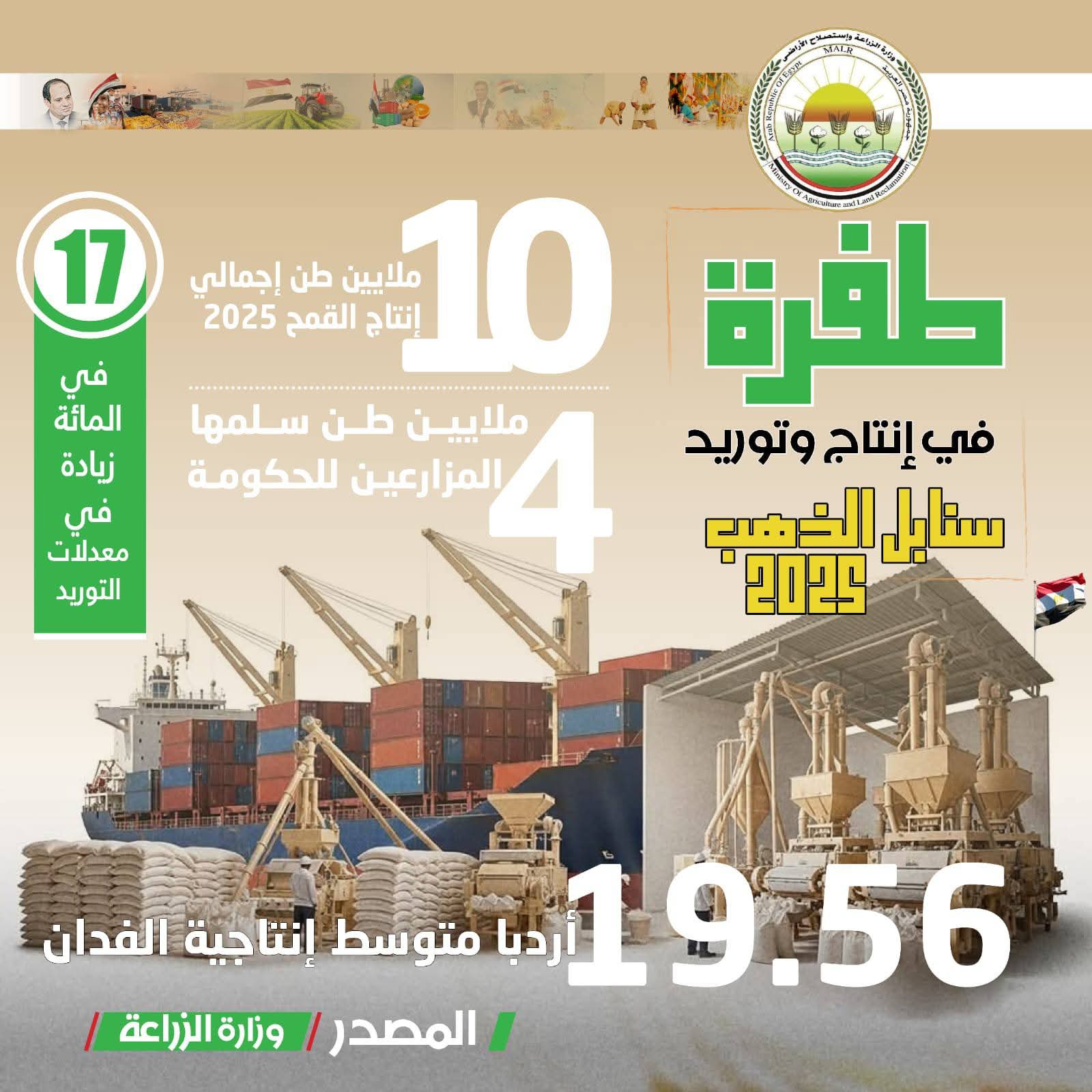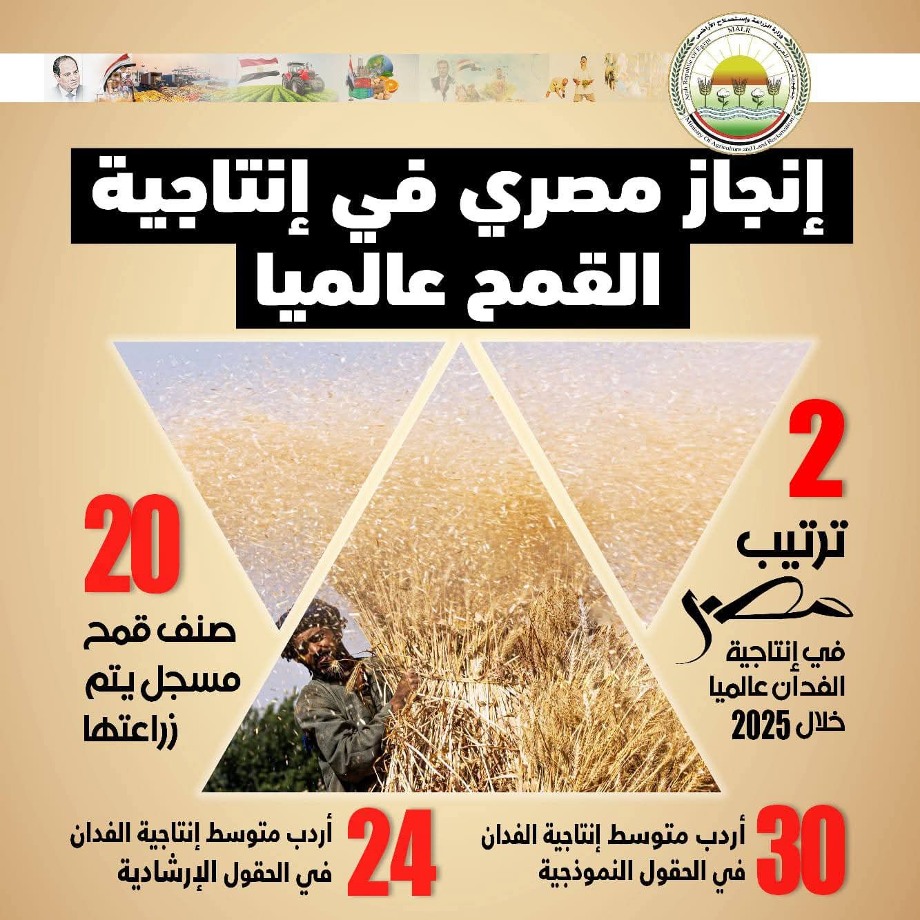 نجحت وزارة الزراعة المصرية بفضل جهود المعاهد البحثية التابعة لها في تحقيق طفرة في إنتاج وتوريد محصول القمح خلال 2025، حيث وصل متوسط إنتاجية الفدان ل 19.56 أردب، وحصد المركز الثاني عالميا في إنتاجية المحصول.
