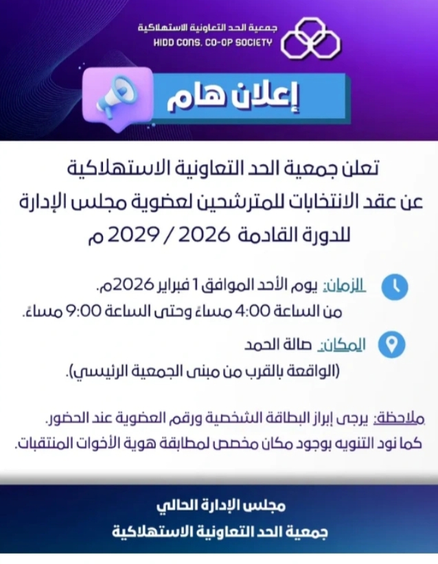 ينتخب اليوم أعضاء الجمعية العمومية لجمعية "الحد" التعاونية الاستهلاكية بالبحرين مجلس إدارة جديد ليقود الجمعية للدورة القادمة 2026-2029.