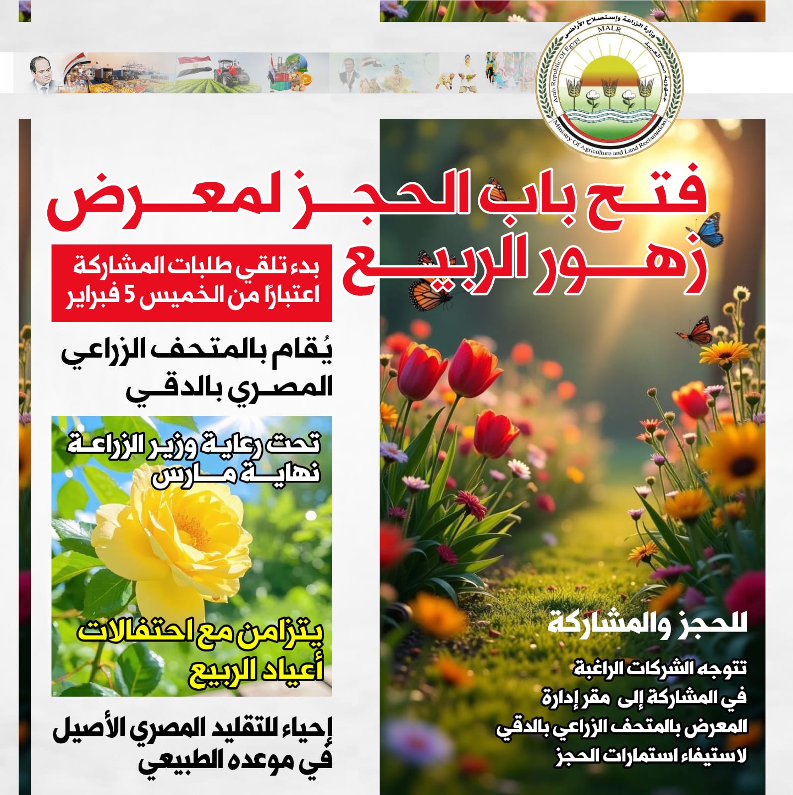 أعلنت وزارة الزراعة واستصلاح الأراضي، عن بدء تلقي طلبات الحجز للشركات والمؤسسات الراغبة في المشاركة بفعاليات "معرض زهور الربيع" في دورته الجديدة لعام 2026، في النسخة 93، والمقرر إقامته بالمتحف الزراعي المصري بالدقي، تحت رعاية م. علاء فاروق وزير الزراعة واستصلاح الأراضي، نهاية مارس المقبل.