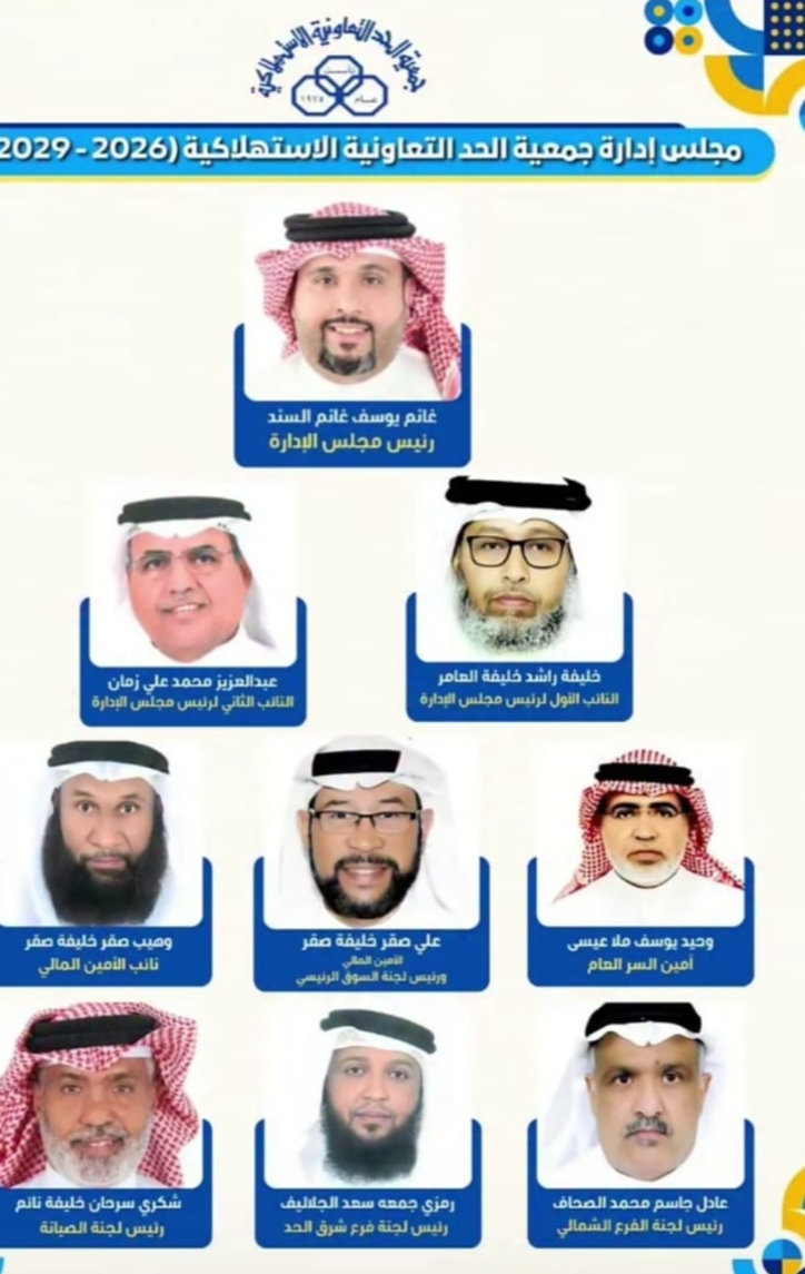 بعد انتخابات حرة ونزيهة وإعلان الفائزين بعضوية مجلس إدارة جمعية "الحد" الاستهلاكية بالبحرين أعلن مجلس إدارة الجمعية عن التشكيل الإدارى للمجلس وجاء على النحو التالى: