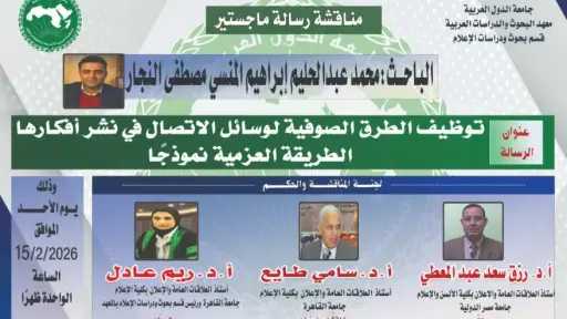 شهد معهد البحوث والدراسات العربية التابع لجامعة الدول العربية، الأحد 15 فبراير 2026، مناقشة رسالة ماجستير بقسم بحوث ودراسات الإعلام، تناولت البنية الاتصالية للطرق الصوفية من منظور علمي تحليلي، في خطوة بحثية لافتة تمس أحد أكثر الحقول الدينية حضورًا وتأثيرًا في المجال العام.
