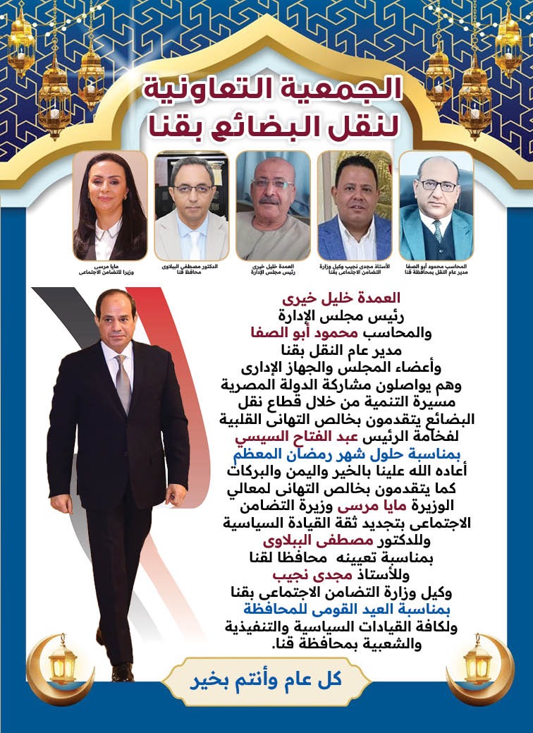 هنأ خليل خيرى عميد قطاع نقل البضائع التعاونى رئيس جمعية نقل بضائع قنا وأمين سر الجمعية العامة لنقل البضائع والمحاسب محمود أبو الصفا مدير النقل بقنا وأعضاء مجلس إدارة جمعية نقل بضائع قنا فخامة الرئيس عبد الفتاح السيسي بحلول شهر رمضان المعظم كما تقدموا بخالص التهانى لمعالي الوزيرة مايا مرسى بتجديد الثقة وزيرا للتضامن الاجتماعى ولمعالى الدكتور مصطفى الببلاوى بمناسبة تعيينه محافظا لقنا ولأسرة التضامن الاجتماعى بالمحافظة برئاسةالأستاذ مجدى نجيب وكيل وزارة التضامن الاجتماعى بقنا ولجموع الأمتين العربية والإسلامية بهذه المناسبة الغالية.