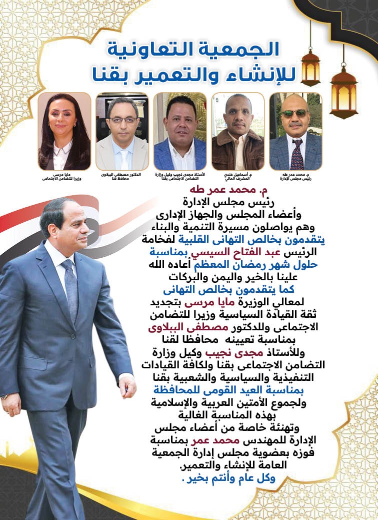 يتقدم م. محمد عمر طه رئيس مجلس إدارة جمعية الإنشاء والتعمير بقنا عضو الجمعية العامة للإنشاء والتعمير وم. إسماعيل هندى المشرف المالى للجمعية وأعضاء مجلس الإدارة بخالص التهانى القلبية لفخامة الرئيس عبد الفتاح السيسي بمناسبة حلول شهر رمضان المعظم كما يتقدمون بخالص التهانى لمعالى الوزيرة مايا مرسى بمناسبة تجديد الثقة وزيرا للتضامن الاجتماعى وللدكتور مصطفى الببلاوى بثقة القيادة السياسية وتعيينه محافظا لقنا ولأسرة التضامن الاجتماعى بالمحافظة برئاسة الأستاذ مجدى نجيب وكيل وزارة التضامن الاجتماعى بقنا ولجموع الأمتين العربية والإسلامية بهذه المناسبة الغالية.