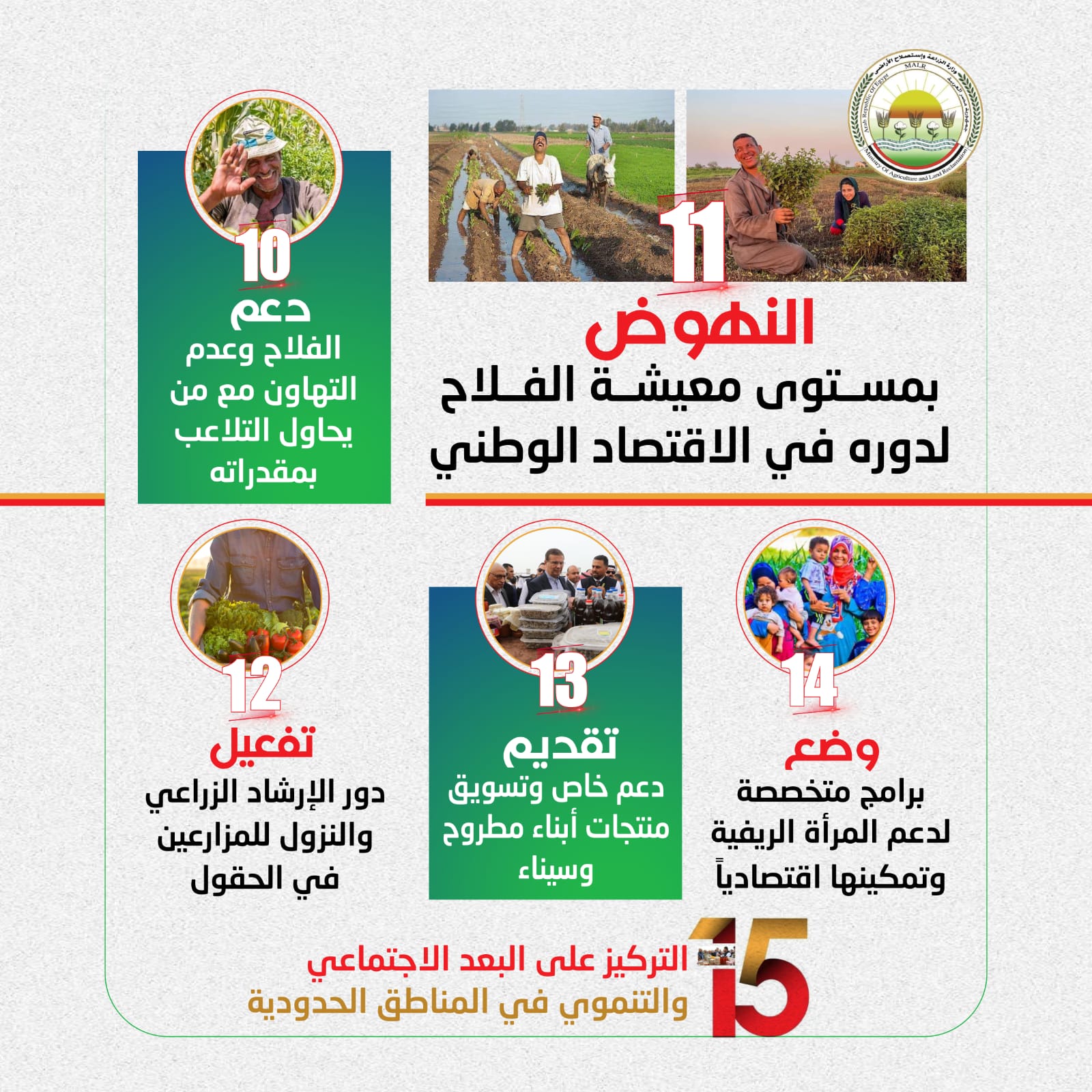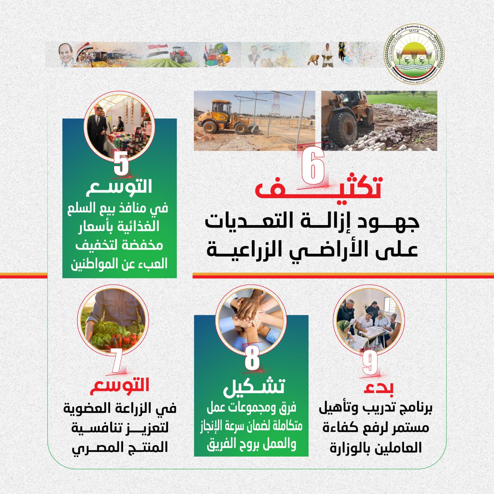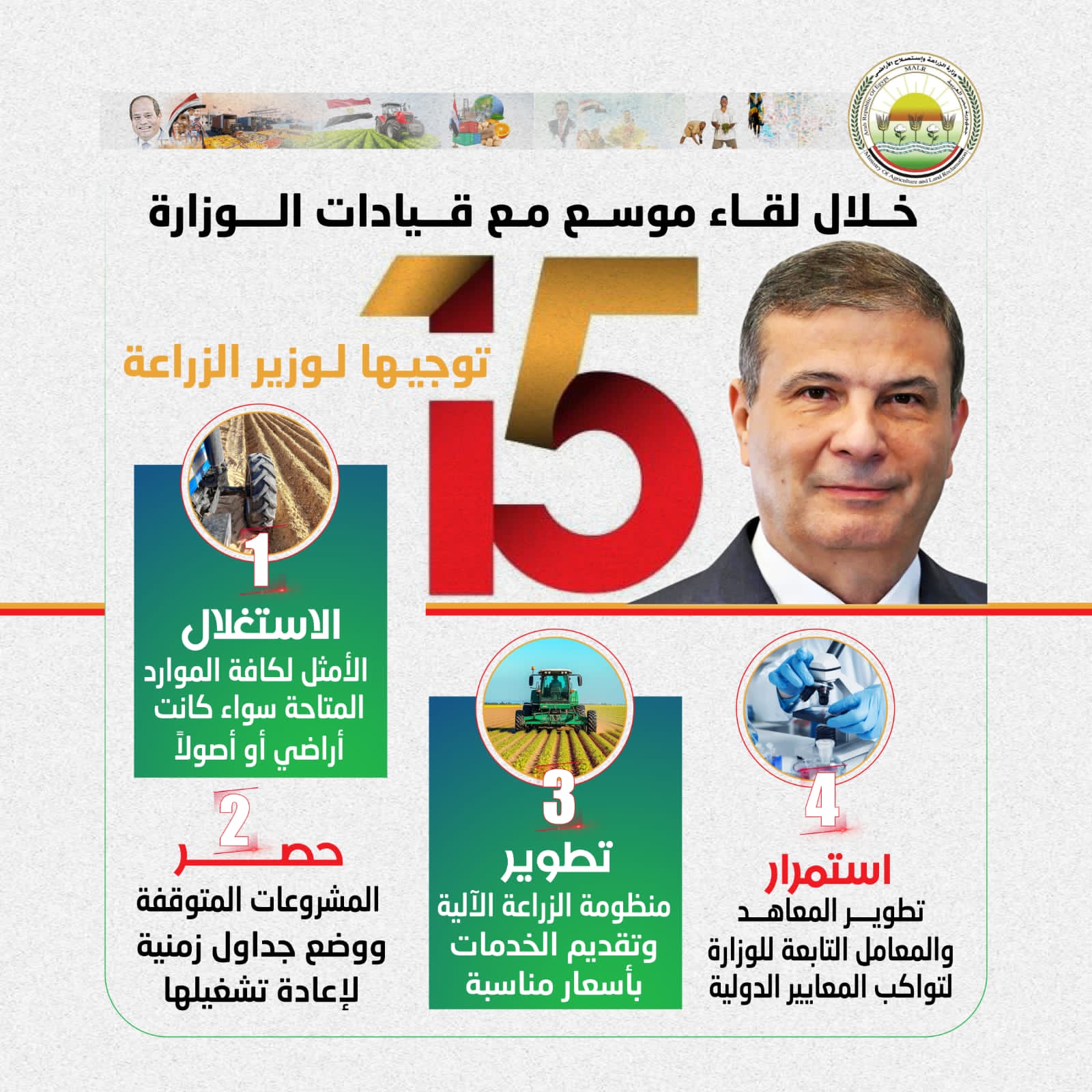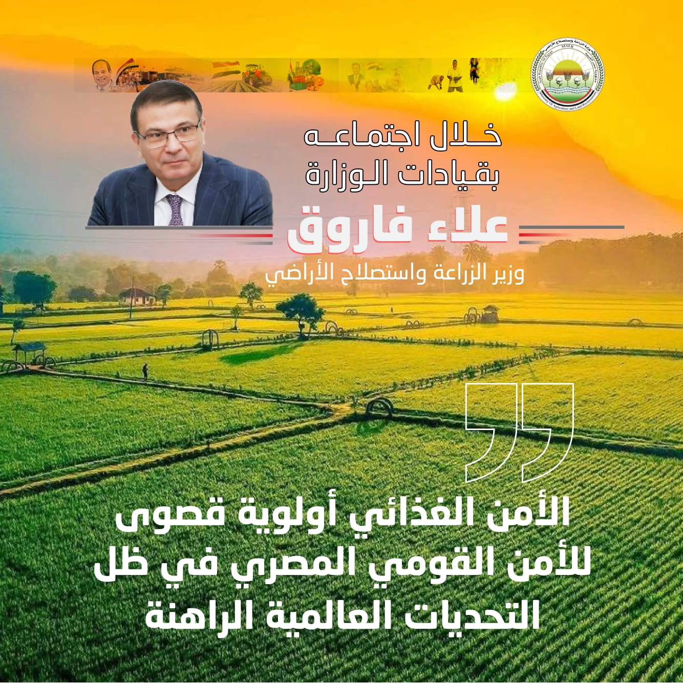 عقد السيد علاء فاروق، وزير الزراعة واستصلاح الأراضي، اجتماعاً موسعاً مع قيادات الوزارة ورؤساء الهيئات والقطاعات التابعة، بحضور المهندس مصطفى الصياد نائب وزير الزراعة، لوضع خطط عمل المرحلة المقبلة ومتابعة التكليفات العاجلة للنهوض بالقطاع الزراعي، مؤكداً أن الأمن الغذائي هو أولوية قصوى للأمن القومي المصري في ظل التحديات العالمية الراهنة.. ونرصد أهم ما جاء فى اجتماع الوزير من خلال الإنفوجراف التالى ...