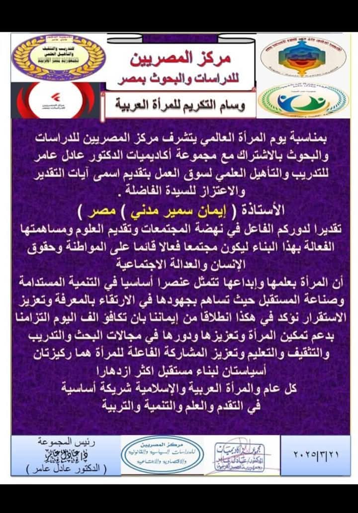 بمناسبة اليوم العالمى للمرأة .. مركز المصريين للدراسات والبحوث يكرم د. إيمان مدنى