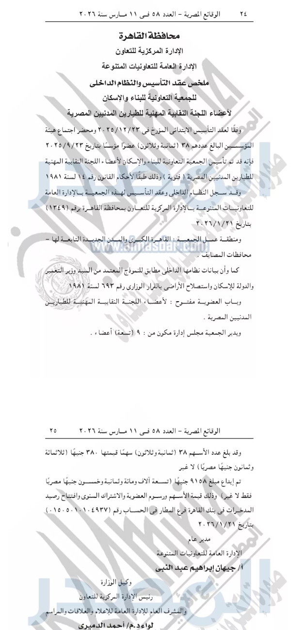 نشرت الوقائع المصرية، في العدد 58، الصادر في 11 مارس سنة 2026، قرار محافظة القاهرة، الإدارة المركزية للتعاون، الإدارة العامة للتعاونيات المتنوعة، بشأن ملخص عقد التأسيس والنظام الداخلى للجمعية التعاونية للبناء والإسكان لأعضاء اللجنة النقابية المهنية للطيارين المدنيين المصرية.