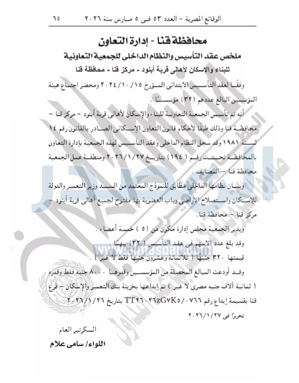 كما نشرت الوقائع المصرية فى العدد 53 الصادر فى 26 مارس 2026 قرار محافظة قنا ، إدارة التعاون بشأن ملخص عقد التأسيس والنظام الداخلى للجمعية التعاونية للبناء والإسكان لأهالى قرية أبنود مركز قنا ، محافظة قنا.