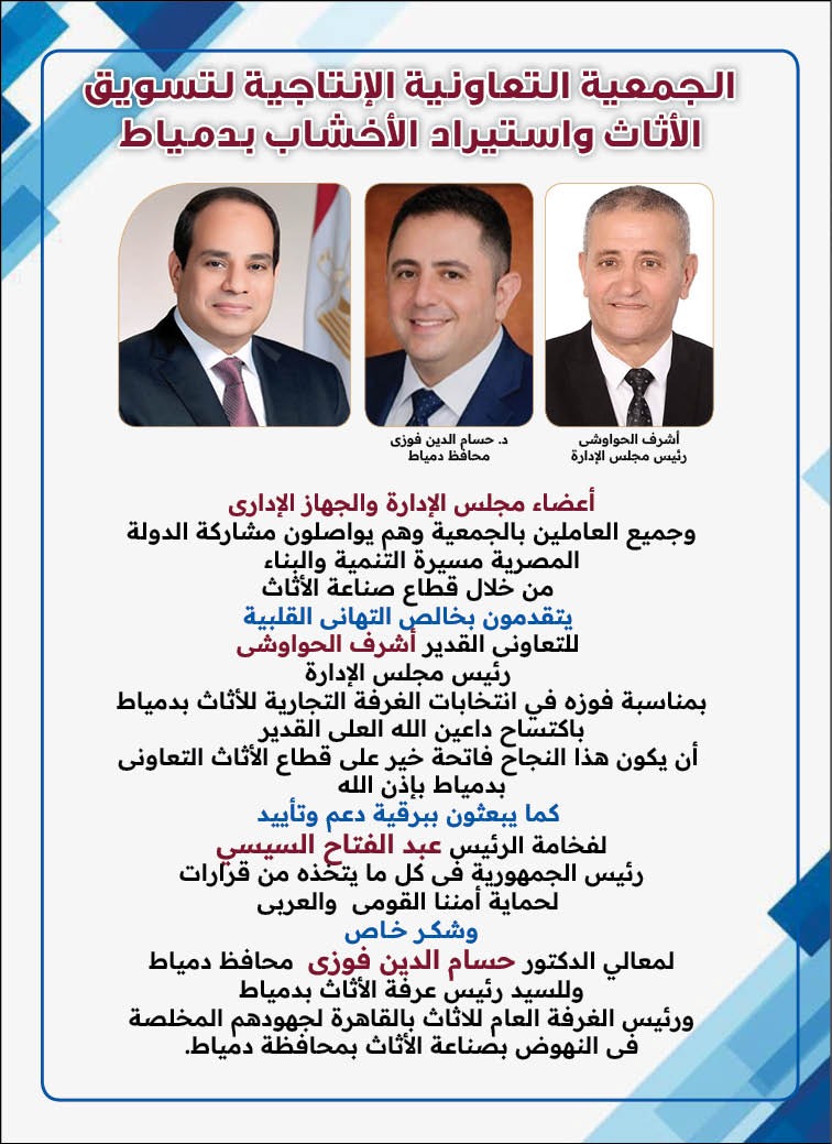 كما تقدم رئيس مجلس إدارة جمعية تسويق الأثاث واستيراد الأخشاب بدمياط بالشكر لرئيس الغرفة التجارية بدمياط ولرئيس الغرفة العام للأثاث بالقاهرة لدعمهم اللامحدود لأعرق صناعة فى تاريخ محافظة دمياط وهى صناعة الأثاث ولأعضاء الجمعية العمومية لشعبة الأثاث بدمياط الذين كانوا خير سند وخير داعم فى هذا الحدث الكبير.