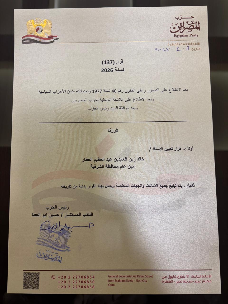 من ناحيته، أعرب خالد العطار عن تقديره لثقة قيادة الحزب، مؤكدًا عزمه العمل على تطوير الأداء التنظيمي في محافظة الشرقية، وتعزيز التواصل مع المواطنين، بما يسهم في تحقيق أهداف الحزب ورؤيته السياسية.