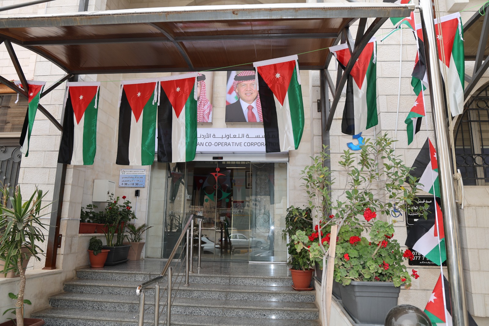 وتزين مبنى المؤسسة التعاونية بالأعلام الأردنية ضمن لوحة وطنية تُعبر عن قيم الولاء والانتماء والاعتزاز برموز الوطن والهوية الأردنية، فيما جاب موكب من مركبات المؤسسة المُزينةِ برايات الوطن الشوارع من حولها.